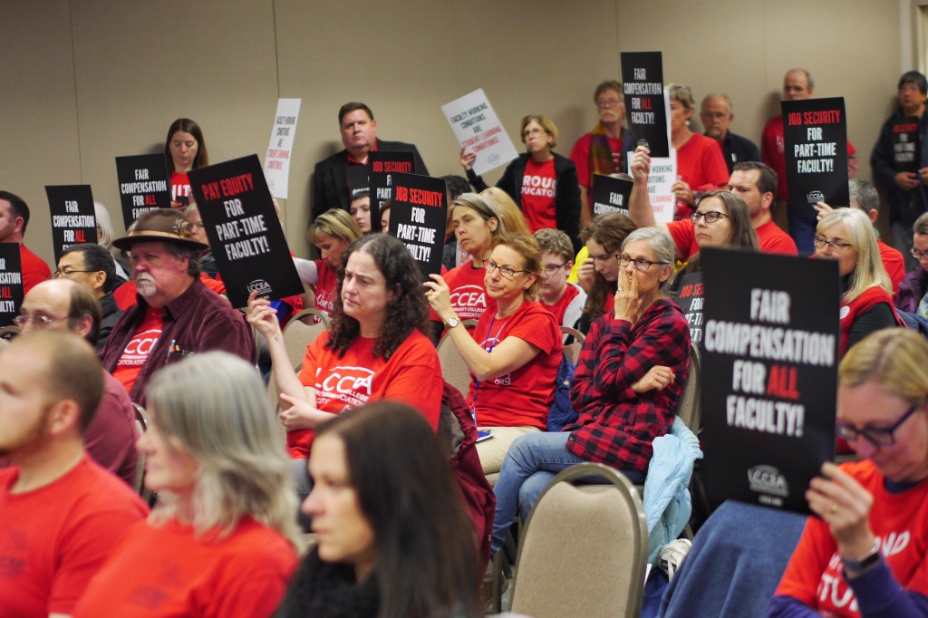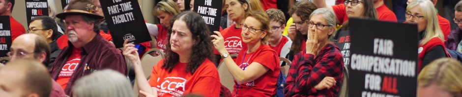In addition, retired faculty members and one retired dean made public statements at the meeting in support of fair compensation for all faculty, movement toward pay equity for part-time faculty, a minimum number of full-time faculty, and the critical need to reverse the trends in college spending and instead invest in the instructional mission.