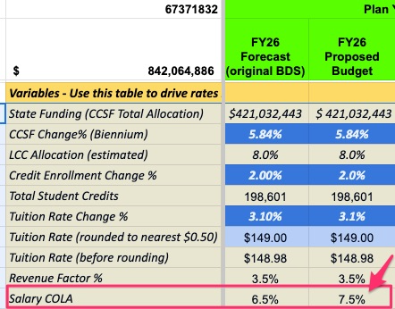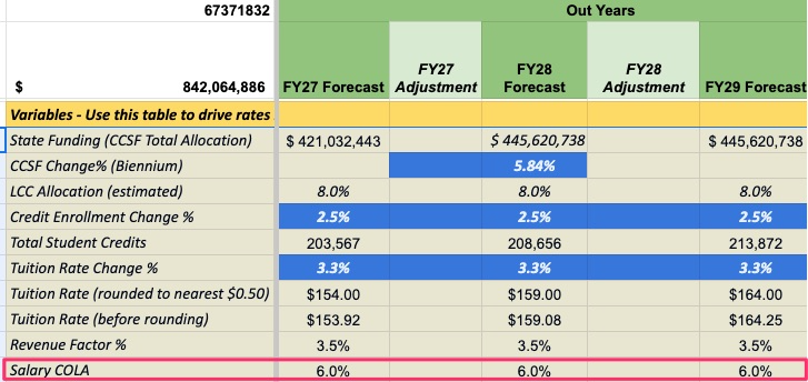 This year’s budget (i.e., FY26) had been balanced by the Budget Development Subcommittee and approved unanimously by the College Council, including students, stakeholders, and all top ranking administrators in voting positions. Even though it was approved unanimously, the Administration presented a different budget to the Board and its Budget Committee in May, making numerous changes, some of which are especially impactful in exaggerating expense estimates. For instance, the Administration changed the COLA (i.e., cost of living adjustment AKA salary schedule increase) built into the budget by increasing it from 6.5% to 7.5% for all employee groups, which added pressure to the budget and resulted in the call to cut $675,000 from the budget, which the Board did approve in June. You can see this increase in the Budget and Finance Office’s own forecasting model, a screenshot of which is below showing the change.