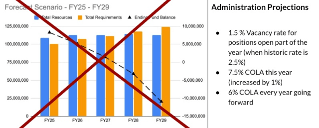In addition, budget forecasts for multiple future years build substantial COLAs for all employee groups into each year. These compound to significantly overestimate future expenses. Please see below for another screenshot of the Administration’s own forecasting tool showing 6% COLAS built into each and every year for the next three years.