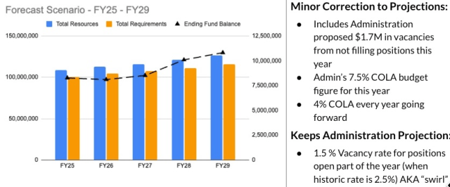 However, if one makes the most minimal adjustments such as including the $1.7M in vacancies the Administration stated on September 3 they will build into this year’ s budget and using 4% as a placeholder figure for COLAs for future years, even while maintaining the Administration’s 7.5% COLA figure for this year, the trajectory is positive, exceeding board policy requirements. Please see the chart below, again utilizing the Administration’s own modeling tool, showing growing reserves with revenue exceeding expenses each year.