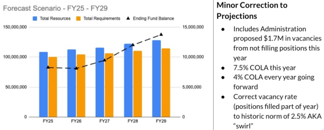 And furthermore with the application of the norm for the vacancy rate (i.e., 2.5% AKA “swirl”), the Administration’s forecasting tool shows a substantial increase to reserves, far and above the Ending Fund Balance policy requirement. Please see chart below.