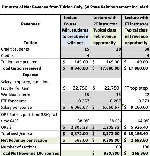 - Cutting lecture classes, which generate substantial net revenue on tuition alone without any state reimbursement, will not only remove opportunities for students, it hurts the bottom line. LCC will lose money and close the door to students. See below for details. A lecture class with only 15 students taught by a top-paid part-time faculty member generates net revenue. A single lecture class with 30 students generates nearly $10,000 in net revenue (after subtracting full salary and full OPE overhead costs). 100 sections generate nearly $1,000,000. A similar course taught by a full-time instructor at the top of the salary schedule generates $2700 in net revenue and $269,360 for 100 sections. Please note: these revenues are generated based on tuition alone, so state funding is excluded from these calculations, and the growth cap in the CCSF does not apply.