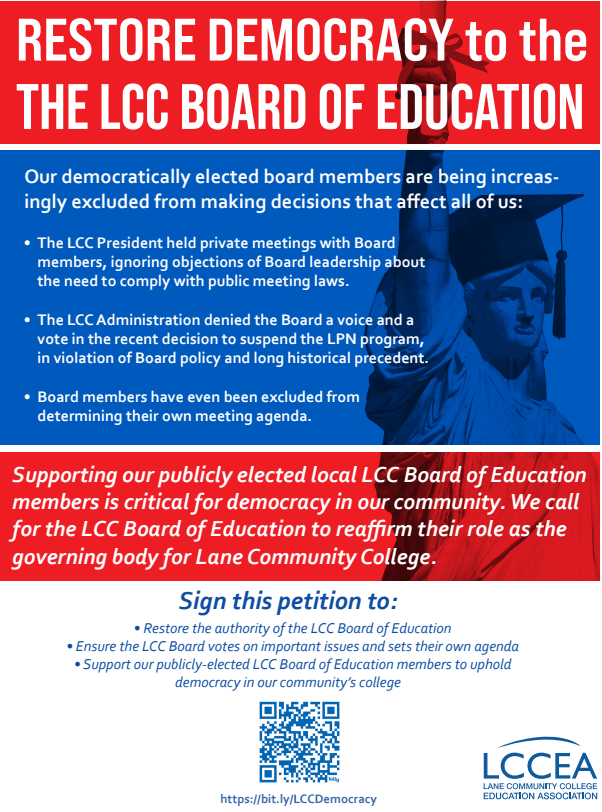 These public records reveal a deeply concerning dynamic at the level of the Board of Education whose authority has been effectively sidelined by the LCC Administration. While this information may be alarming, it is important for faculty and our broader community to take heart and take action to join the call to restore democracy at our community’s LCC Board of Education.